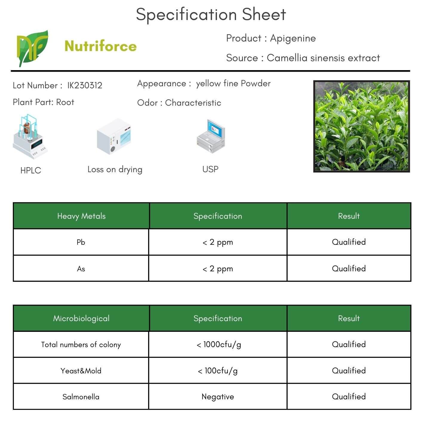 Notre apigénine est extraite de la meilleure source naturelle, la plante Matricaria chamomilla avec un processus unique et des normes strictes.