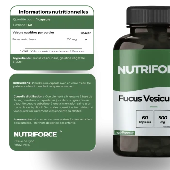 En stimulant le métabolisme via son action sur la thyroïde et en réduisant les apports caloriques grâce à son effet coupe-faim, le Fucus devient un véritable accélérateur minceur. Associé à une alimentation équilibrée, il soutient efficacement les objectifs de perte de poids.