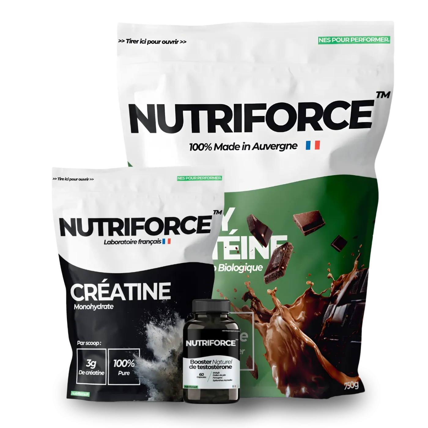 L’association whey protéine, créatine monohydrate et complexe booster de testostérone crée un environnement anabolique optimal.