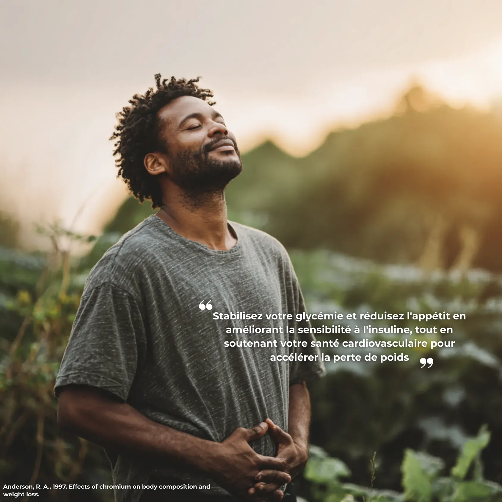 Le chrome améliore naturellement la sensibilité à l’insuline et favorise un meilleur contrôle de la glycémie. Maintenez des taux de sucre stables tout au long de la journée pour éviter les pics et les chutes d’énergie.