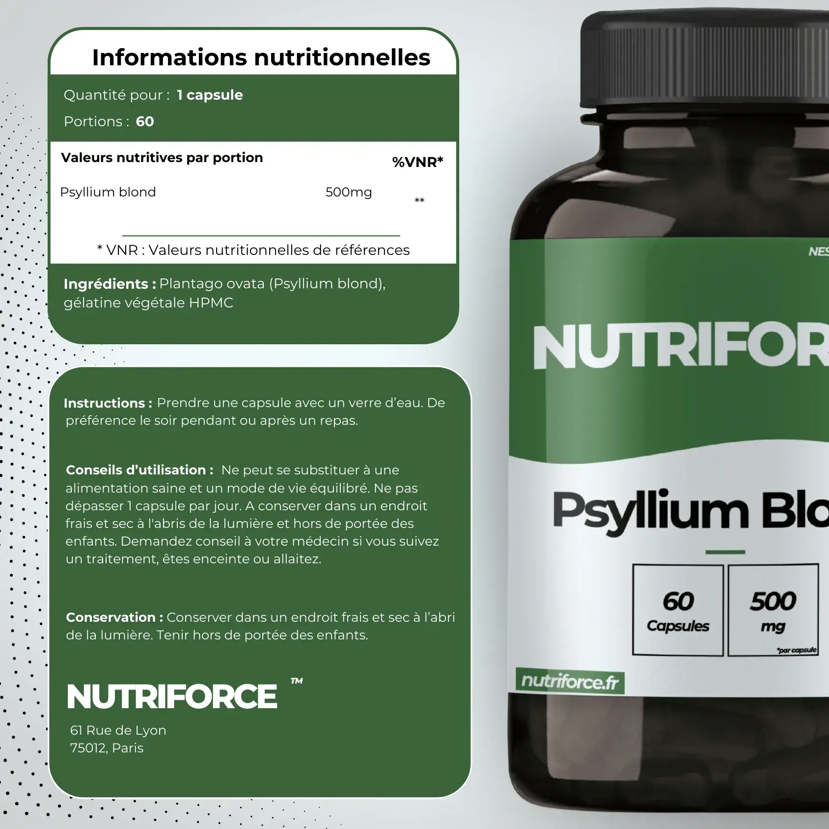 Psyllium pure 500mg, gélatine végétale (capsule à base de cellulose)